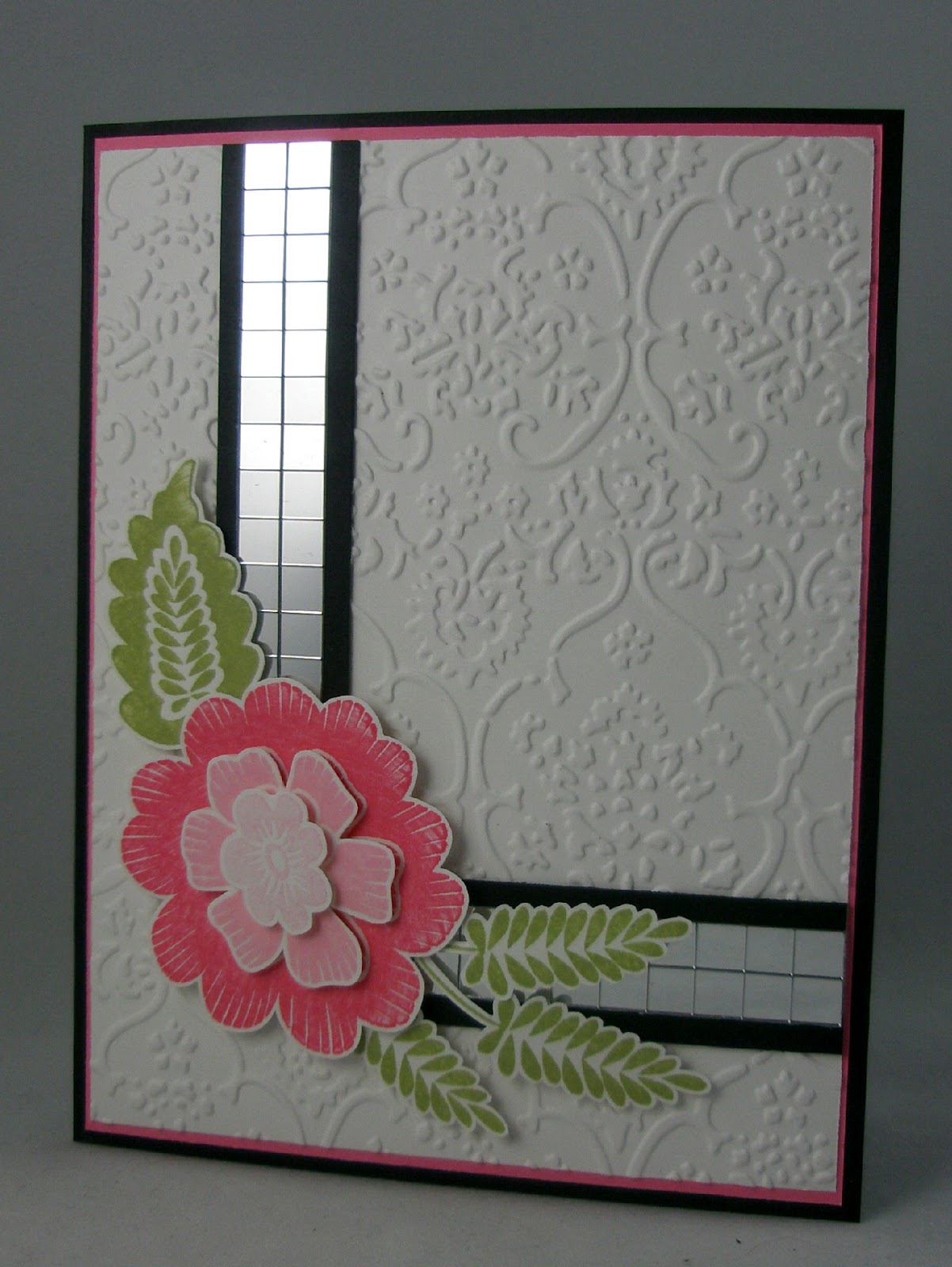 I used a double strip of the stickers on top of some black cs. That, in turn, was mounted on a piece of Whisper White that I had embossed. Where the mirror strips met I added a pink layered flower and leaves from the Array of Sunshine stamp set. All this was added onto a base of Regal Rose and then the card itself on black card stock.
