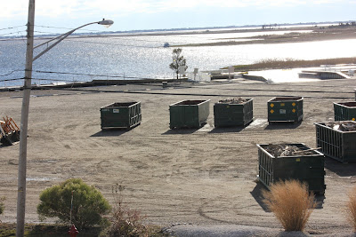 The dumpsters were lined up and as they were filled the dozer would slide them across the parking lot.  Oh, it was noisy but necessary.  You see that tree near the water below?  The dockmasters shed used to be between that tree and the boat ramp.  They have no idea where it ended up.  It could have broken up and be behind us or it could have been sucked back into the bay by the wind.